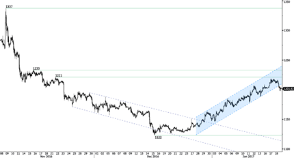 يواصل الدولار الأمريكي مقابل الين الياباني تراجعه داخل قناة الاتجاه الهبوطي. لا يزال المجال مفتوح نحو الدعم لكل ساعة عند مستوى 112.58 (تراجع 12/01/2017). يتضمن الحد الأعلى من القناة الهبوطية مستوى المقاومة لكل ساعة. من المتوقع أن يشهد مزيداً من الضغوط الهبوطية. نرجح انحيازاً هبوطياً طويل المدى. ويكون الدعم حالياً عند مستوى 96.57 (تراجع 10/08/2013). يبدو الارتفاع التدريجي نحو مستوى المقاومة الرئيسي عند 135.15 (ارتفاع 01/02/2002) أقل احتمالاً. من المتوقع أن يشهد مزيد من التراجعات والدعم عند مستوى 93.79 (تراجع 13/06/2013).